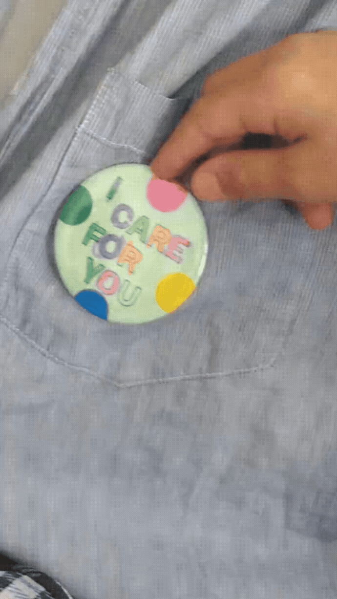 Im Button-Workshop gestalteten Kinder individuelle Anstecker, die Sichtbarkeit schaffen: Wofür sorge ich in meinem Alltag? Für das Haustier, das Geschwisterchen oder indem beim Tischdecken geholfen wird? Auch die Realität von Young Carers kann hier spielerisch angedeutet werden. Mit wilden Kritzeleien, bunten Collagen oder kleinen Care-Botschaften entstehen schillernde Anstecker, welche die Botschaft nach außen tragen.