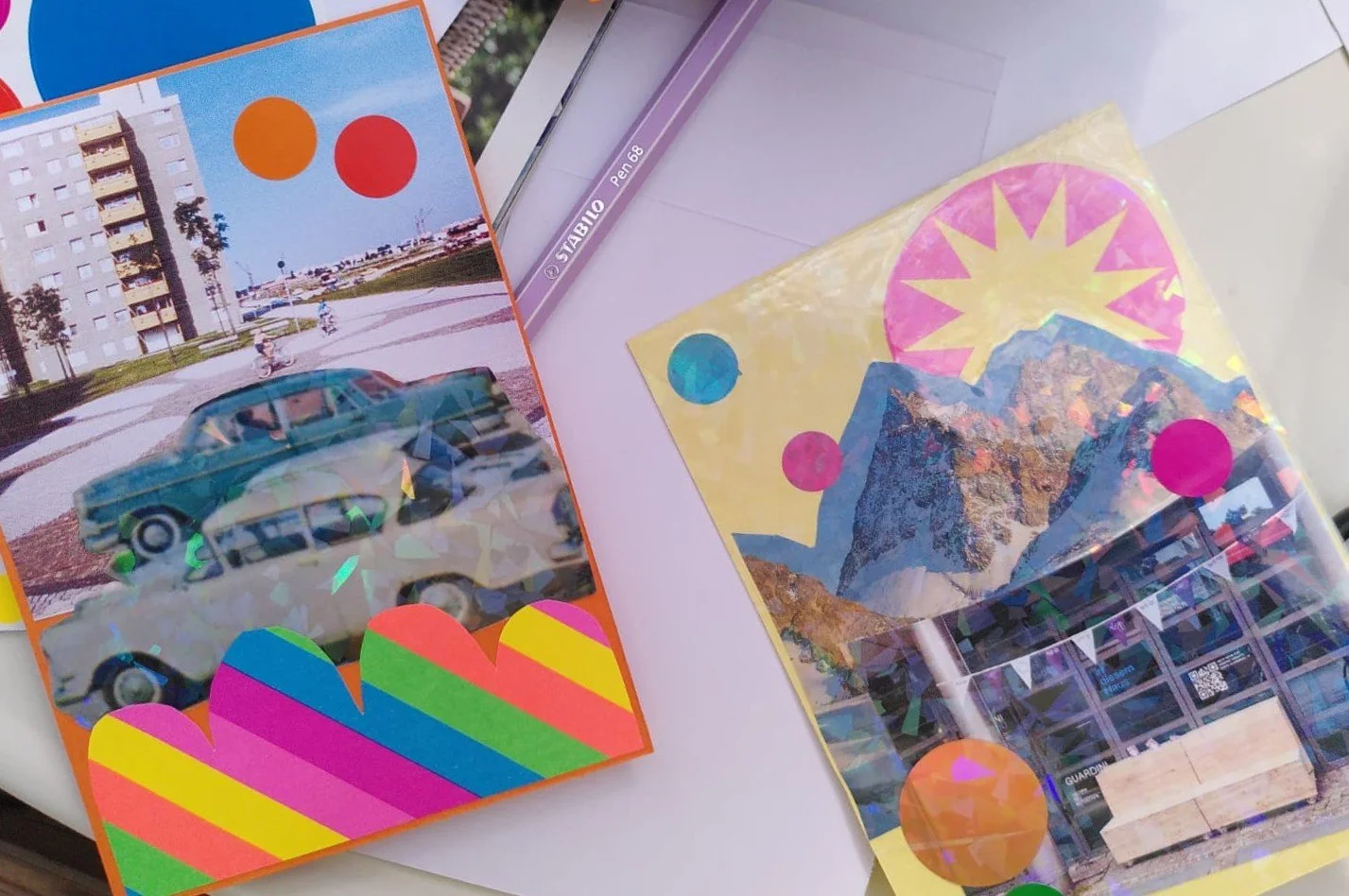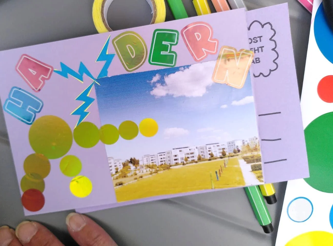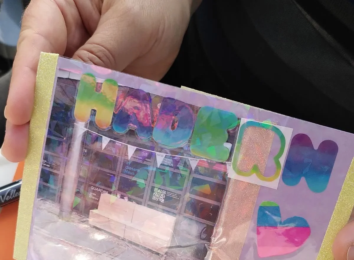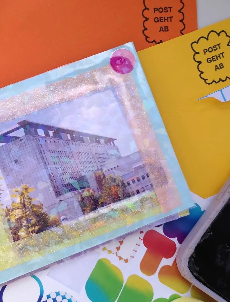 Am 17.07.2025 ging an der MITMACH-Bank des Guardini90 die Post ab: Mit Fotomaterial aus Hadern, Schnipseln aus Reiseführern oder Magazinen werden die Klebestifte heißlaufen! Denn damit werden die vorgedruckten Postkarten gestaltet, um sommerliche Grüße aus dem Stadtteil zu verschicken.