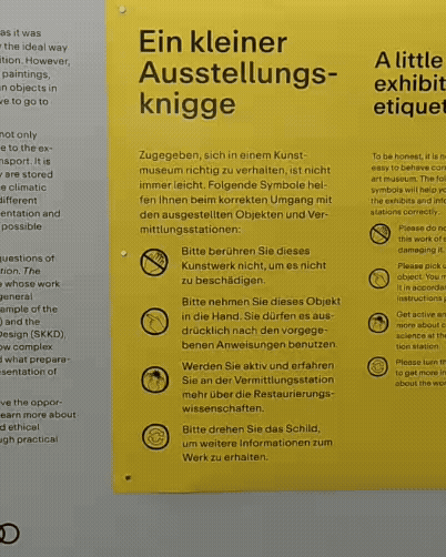 Besuchende können bei der Ausstellung an verschiedenen Stationen selbst aktiv werden und durch Mitmach-Stationen Methoden, Prozesse oder auch ethische Grundsätze von Restaurationsarbeit kennenlernen.